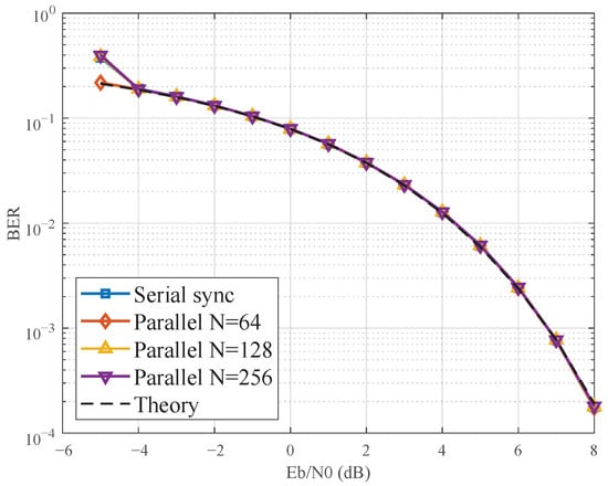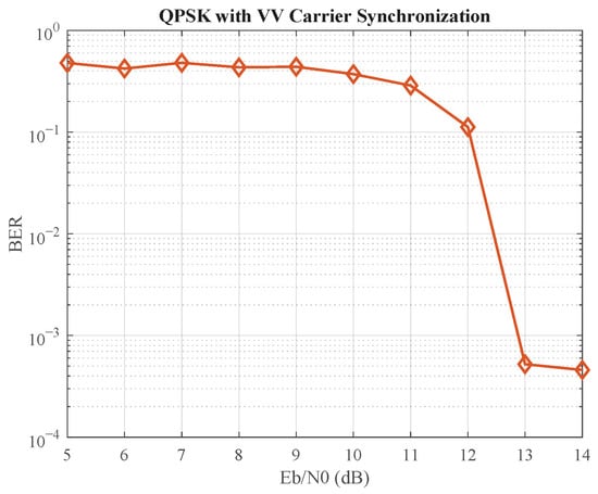 The proposed framework was validated through the design of a highly parallel Costas carrier recovery loop. Simulations confirmed that the parallel loops retained the locking behavior and BER performance of the serial loop, with only a minor and graceful performance degradation as the parallelization factor increased. Compared with a classical Viterbi–Viterbi feedforward estimator, the parallel Costas loop exhibited dramatically improved robustness at low Eb/N0, avoiding the severe error floors observed for VV.