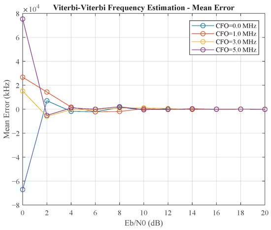 Finally, we benchmarked our proposed parallel closed-loop method against the widely used open-loop Viterbi–Viterbi (VV) feedforward algorithm. Figure 8 and Figure 9 illustrate the performance of the VV frequency estimator. It shows a critical weakness: its accuracy degrades precipitously at low Eb/N0. Specifically, as shown in Figure 9, the standard deviation of the frequency estimate explodes to several hundred kHz for Eb/N0 below 8 dB, rendering the estimate unreliable. This contrasts sharply with the closed-loop method, which maintains a standard deviation below 1 kHz under the same conditions (as shown in Table 1). This performance collapse is characteristic of blind, non-data-aided feedforward estimators, as the underlying phase estimation relies on non-linear operations that amplify noise at low Eb/N0, leading to unreliable block-based estimates.