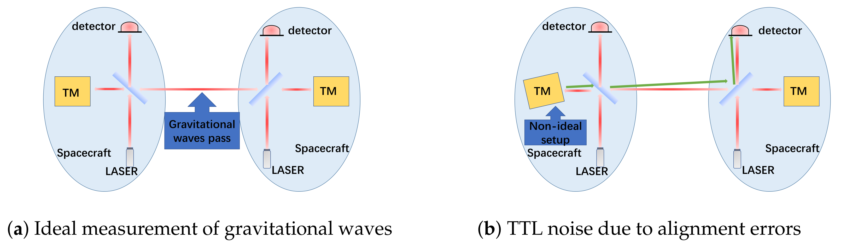 Figure 1b, in practical systems with alignment errors, even in the absence of gravitational waves, angular jitter of the TMs can couple into the longitudinal displacement measurement through TTL effects, creating noise that can obscure the genuine gravitational wave signals. This highlights the critical importance of precise TM alignment for achieving the required detection sensitivity.