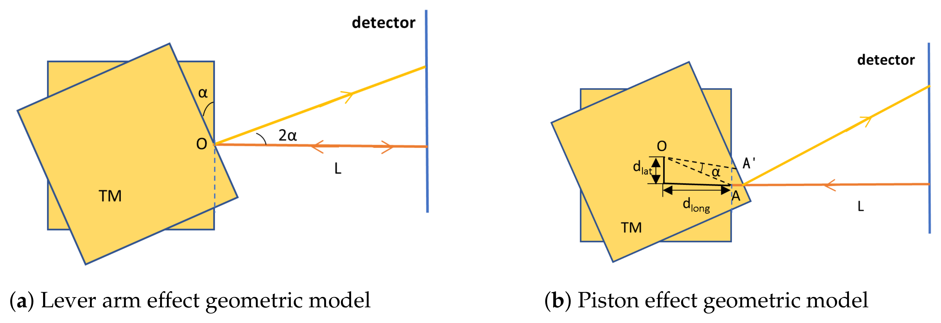 Schematic diagram of the decomposed geometric TTL coupling noise model. In the diagrams, orange lines indicate the original optical path, and yellow lines indicate the optical path after TM rotation. (a) Lever arm effect: The TM rotates by an angle around the reflection point A, where the center of rotation coincides with the reflection point. The reflected beam direction deflects by , causing the geometric path to the detector to lengthen. The resulting is the source of pure second-order TTL coupling. (b) Piston effect: The TM rotates by an angle around the center of rotation O, where offsets exist between O and the reflection point A: lateral offset and longitudinal offset . The reflection point moves from A to . Its longitudinal displacement causes changes in the incident and reflected optical path lengths, constituting the primary source of TTL coupling. In this effect, dominates the first-order coupling, while contributes to the second-order coupling.