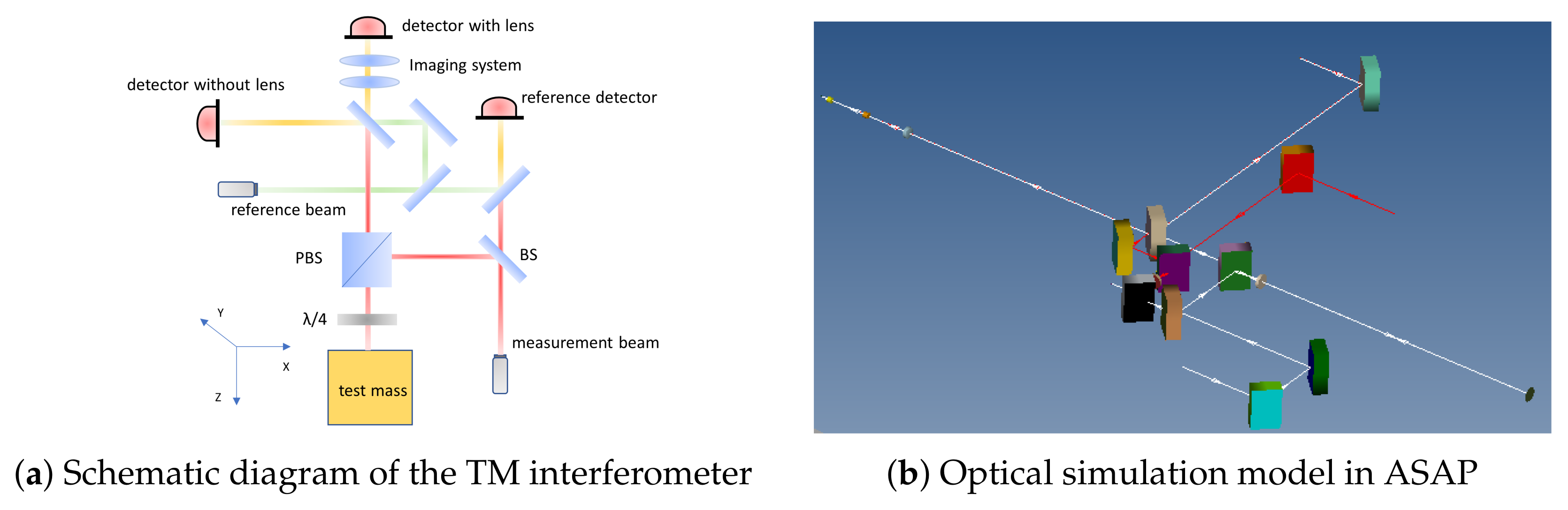 Figure 1b, occurs when the reference beam strikes the detector center perpendicularly while the measurement beam arrives at an oblique angle, causing the measurement beam to traverse an extended optical path compared to the reference beam. Consequently, TTL coupling noise is not generated when the TM rotates about the laser propagation axis, but emerges during rotations about other axes.