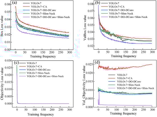 From the data in the table, results can be concluded that YOLOv7 + DO-DConv + Slim-Neck performed the best overall, improved the improvement precision by 6.44% compared to YOLOv7, reduced the recall rate by 1.49%, and the average detection precision increased by 2.41% and 1.93%, respectively, while the F1 score increased by 0.03. The overall performance of YOLOv7 + DO-DConv and YOLOv7 + Slim-Neck is relatively similar. The overall performance of YOLOv7 + CA was the worst, with each indicator being significantly backward from YOLOv7, and the comprehensive performance was not as good as the original YOLOv7 model. In addition, from Figure 4 and Figure 5, although YOLOv7 + DO-DConv + Slim-Neck is close to the curve of the model than the other four in some figures, it is significantly lower than the other models in Figure 4a (loss of bounding box in the training set) and Figure 4d (target loss map in the validation set), and overall superior to the other models.
