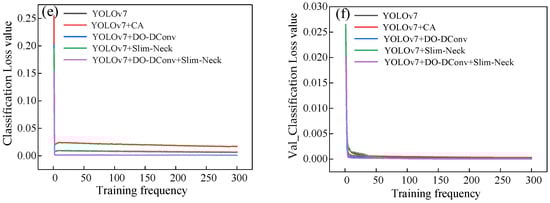 Figure 4 depicts the loss trends for the YOLOv7 model and each improved model during training, along with the overall loss trend for the training set. The overall loss trend of the training set is shown in Figure 5, illustrating the change in the total loss throughout the training process. Specifically, Figure 4a–f represent the loss trends for the training set bounding box loss (Box), validation set bounding box loss (ValBox), training set objectness loss (Objectivity), validation set objectness loss (Val_Objectivity), training set classification loss (Classification), and validation set classification loss (Val_Classification). In general, all the loss curves show a downward trend, eventually stabilizing.