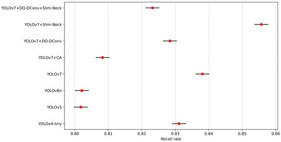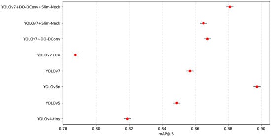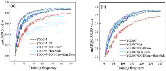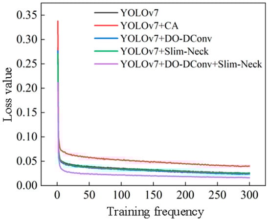 From the parameters of the size and complexity of the reaction model in Table 9, the YOLOv7 + DO-DConv model combined with DO-DD-DConv module reduced the number of parameters and the number of floating point operations per billion (GFLOPs) compared with YOLOv7, but the decrease was slightly lower, by 545,792 and 0.5, respectively, while the GPU consumption increased by 0.01 G, and the training time did not change significantly. After combining the Slim-Neck module, all indicators of the YOLOv7 + Slim-Neck model were greatly reduced, with a GPU consumption and parameter number of 2.48 G and 34,246,516, respectively. The training duration and GFLOPs were 14 h and 38.5, respectively. After simultaneous improvement with DO-DConv and Slim-Neck, the training speed of the YOLOv7 + DO-DConv + Slim-Neck model was further improved, optimal the five sets of models, with GPU consumption, number of parameters, GFLOPs, and training duration of 2.46 G, 33,113,460, 38.2, and 13 h, respectively. The YOLOv7 algorithm combined with CA significantly increased the YOLOv7 algorithm in GPU consumption, parameter number, GFLOPs and training time, with 2.54 G, 37,969,872, 119.7, and 21 h, respectively, which showed the least ideal performance in these five types of models.