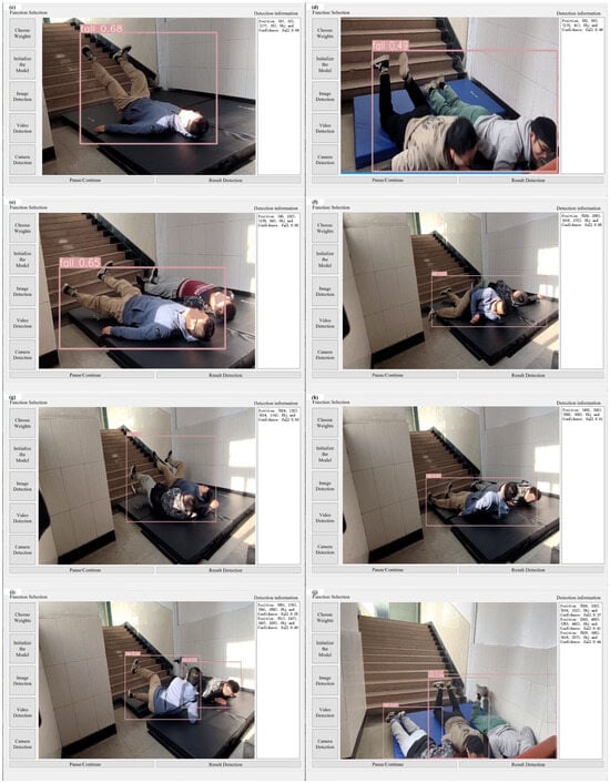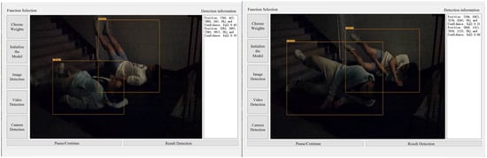 Based on the optimal model parameters obtained from numerical experiments, the existing software was optimized. The software completed the overall system design through an interface development program in Python 3.8, as shown in Figure 3. The interface can use three methods: image, video, and camera detection. To ensure the real-time recognition of objects, this study chose to use camera detection to identify falls in stairwells.