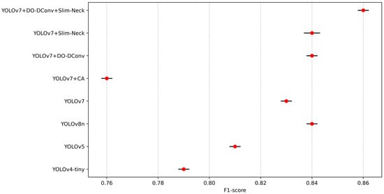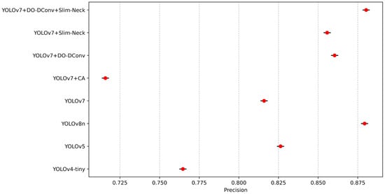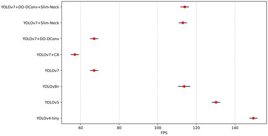 To validate the superior performance of the improved YOLOv7 model, the study compared its performance metrics with those of YOLOv4-tiny, YOLOv5, YOLOv7, YOLOv8n, and the proposed YOLOv7 improvements. The results are presented in Table 9. YOLOv7 + DO-DConv + Slim-Neck outperforms YOLOv4-tiny, YOLOv5, and YOLOv8n in terms of detection precision, speed, and efficiency. It achieves the highest precision (88.03%), mAP@0.5 (88.10%), and F1 score (0.86), demonstrating superior performance in both object detection precision and model consistency. Although its recall rate (82.32%) is slightly lower than that of YOLOv4-tiny and YOLOv7, it maintains a competitive FPS (114 FPS), similar to YOLOv8n (113 FPS). This combination of high precision and computational efficiency positions YOLOv7 + DO-DConv + Slim-Neck as the most balanced and effective model for practical deployment among the compared algorithms.
