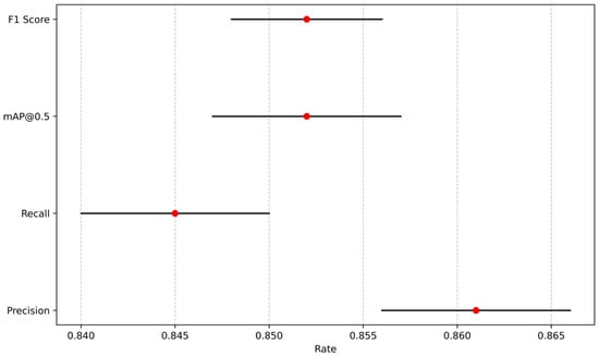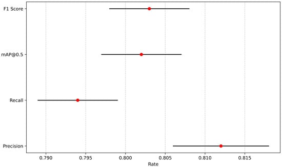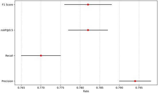 To validate the robustness of the performance differences, statistical tests were conducted to determine whether the improvements in mAP@0.5, F1 score, and FPS are statistically significant and consistent across different runs. Each model was evaluated through ten independent runs with random seeds [2010, 2011, 2021, 2033, 2039, 2047, 2057, 2068, 2074, 2088] under the same training settings with an epoch of 300 using SGD with momentum set to 0.937 and weight decay of 0.0005. To enhance generalization and prevent overfitting, the dataset was augmented with random rotations (±10°), horizontal flipping, and scaling variations to simulate real-world perspective changes. Random masking was applied to small regions to train the model to handle occluded individuals. Figure 10, Figure 11, Figure 12, Figure 13 and Figure 14 present the 95% confidence intervals for all models across the three core metrics. The variability observed across all metrics is minimal, with standard deviation values not exceeding 0.5%.
