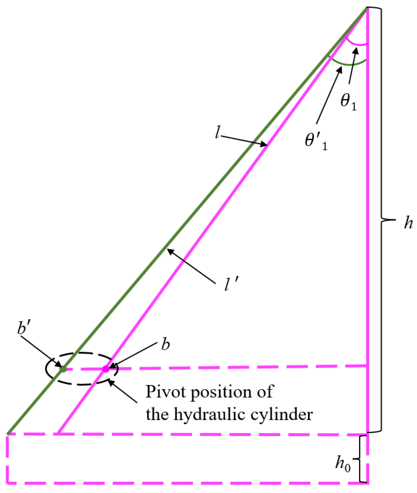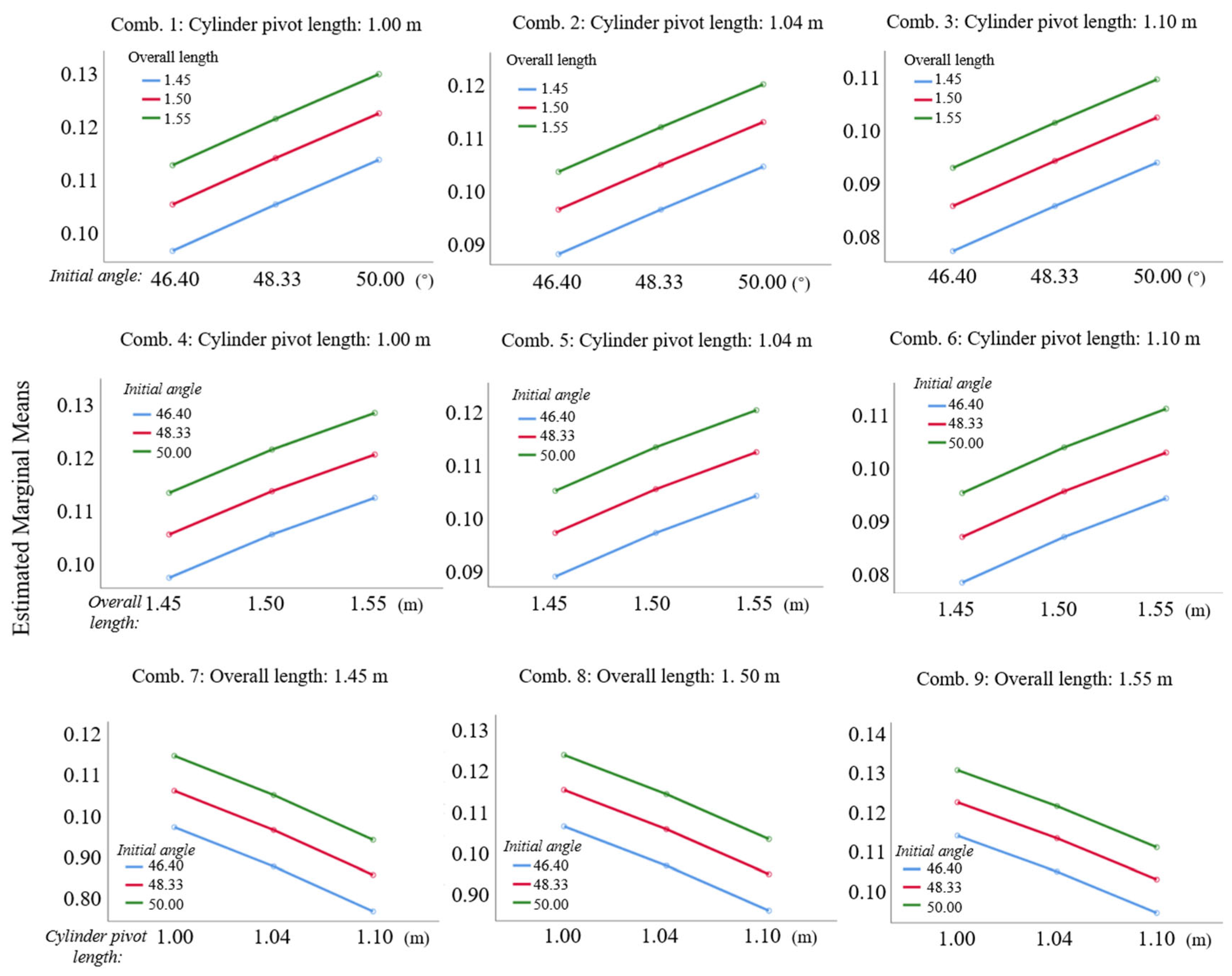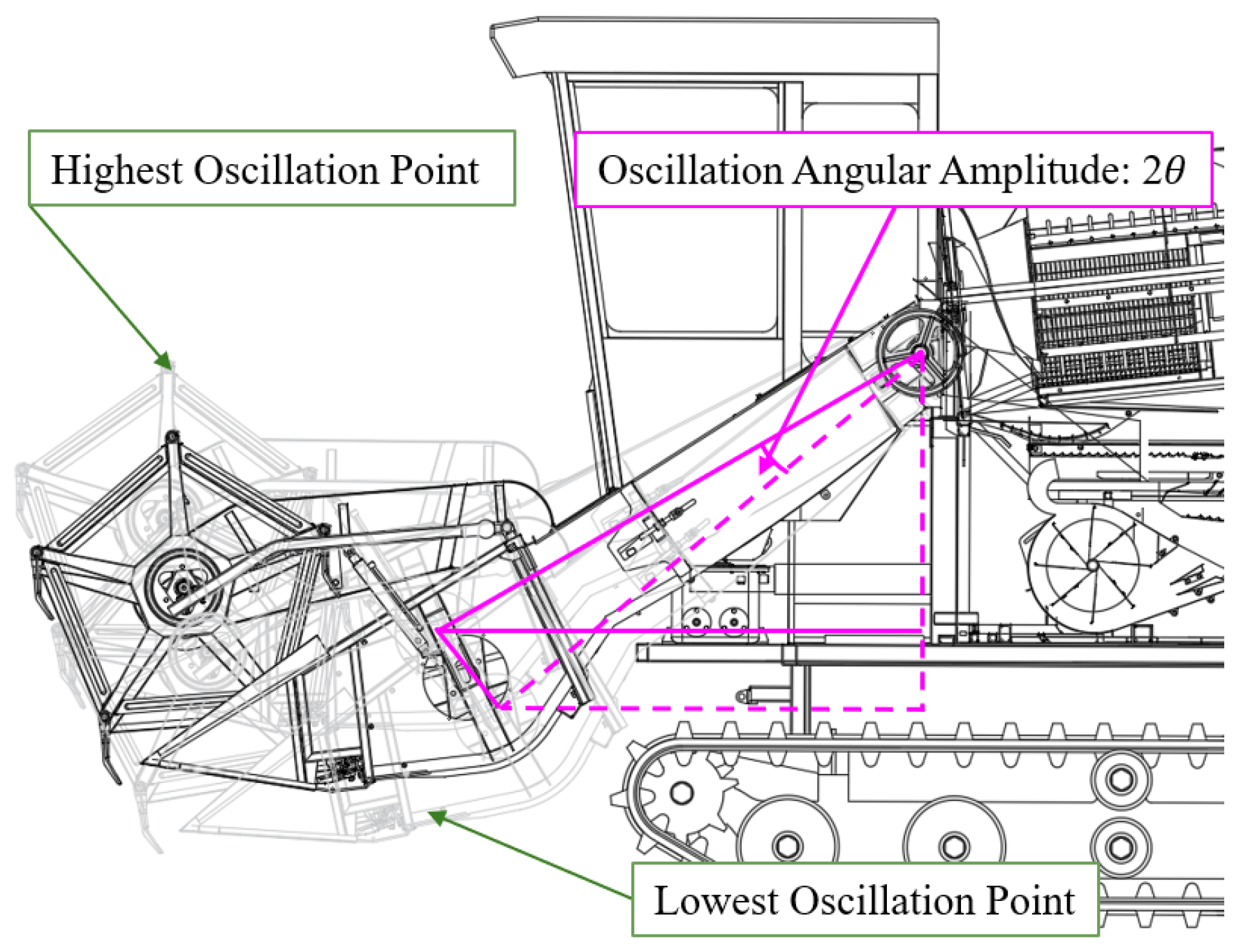 - The study emphasizes the application of sensor data for structural optimization. The dynamic model incorporated simplifications under ideal assumptions, such as neglecting elastic deformation and nonlinear effects; however, the conclusions verify its effectiveness within the engineering scope. The applicable parameter ranges are initial angle 46.4–50°, overall length 1.45–1.55 m, and cylinder pivot length 1.00–1.10 m, which are suitable for combine harvesters operating at constant speed on relatively flat terrain. Deviations beyond these ranges may require revalidation. Future work will address actual device characteristics and complex field conditions to enhance model generality.