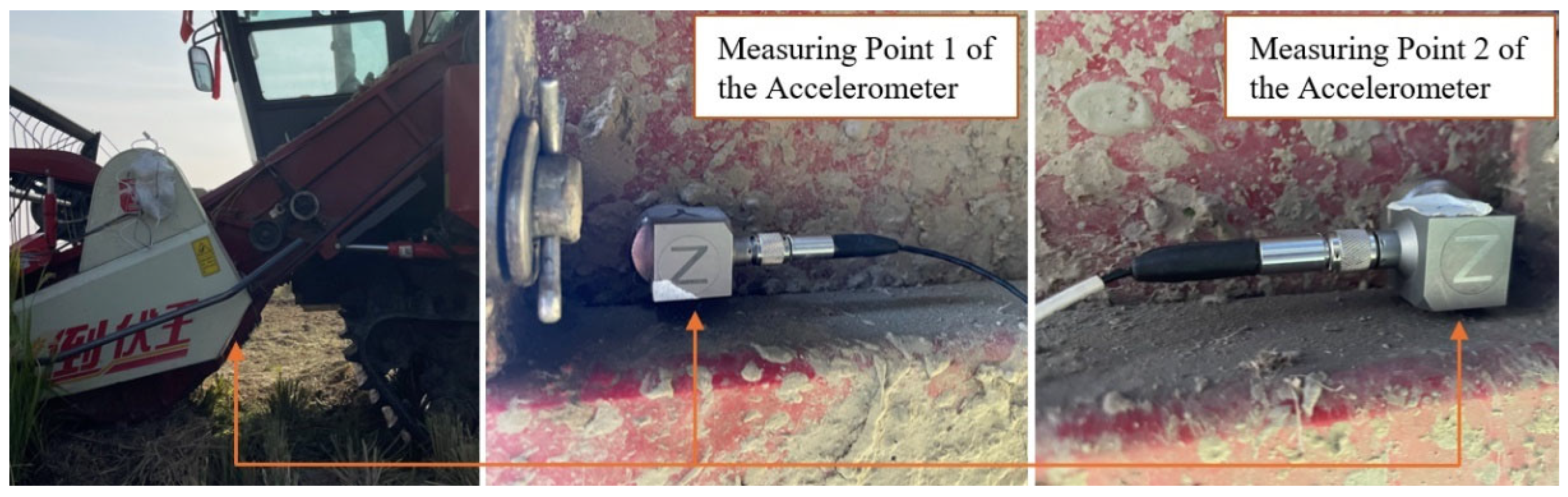 - Gao, Z.; Xu, L.; Li, Y.; Wang, Y.; Sun, P. Vibration measure and analysis of crawler-type rice and wheat combine harvester in field harvesting condition. Trans. Chin. Soc. Agric. Eng. (Trans. CSAE) 2017, 33, 48–55. [Google Scholar] [CrossRef]