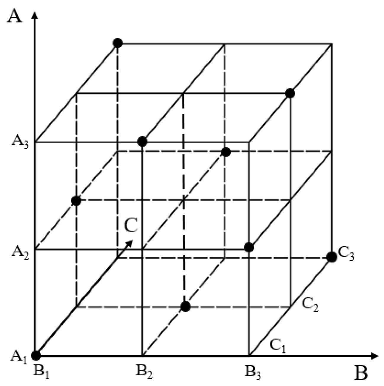 | Level Combination | A1B1C1 | A1B2C2 | A1B3C3 | A2B1C2 | A2B2C3 | A2B3C1 | A3B1C3 | A3B2C1 | A3B3C2 |