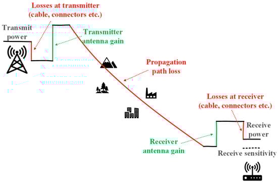 The proposed solution, which is described in detail in Section 2, is assumed to be an additional functionality for a network of nodes monitoring spectral resources, whose primary task is to detect radio signals in specific frequency bands. It integrates seamlessly with existing spectrum-monitoring networks, leveraging their primary detection capabilities to provide valuable location estimates without requiring new hardware or additional sensing effort, thereby extending the system’s overall utility. Based on the detection results from individual nodes and other data (described in detail in the next section), it is possible to estimate the transmitter’s location. It is worth emphasizing that no additional equipment or monitoring time is required to apply the proposed solution. The only effort required is to perform an additional calculation. The presented algorithm can also be used in a cognitive radio network, with spectrum-monitoring functionality as an additional element that enhances situational awareness. The considered method can extend the functionality of any distributed spectrum-monitoring system in both civilian and security domains. In summary, the proposed approach assumes the existence of a network of nodes performing the spectrum monitoring and detection process. On this basis, extending the existing system’s capabilities is possible by estimating the transmitter’s location. When operating several sensors within a network monitoring a given area and frequency range, it is also worth considering whether the results returned by individual sensors relate to the same transmitter. The presented algorithm uses radio signature/fingerprint methods for this purpose. Moving on to the issues linked to the proposed method, it should be noted that each sensor’s detection area depends on its location (propagation conditions), detector parameters (e.g., sensitivity), and the power level of the detected radio signal source. Those factors determine the radio link budget, i.e., received signal power in the detector (Figure 1).
