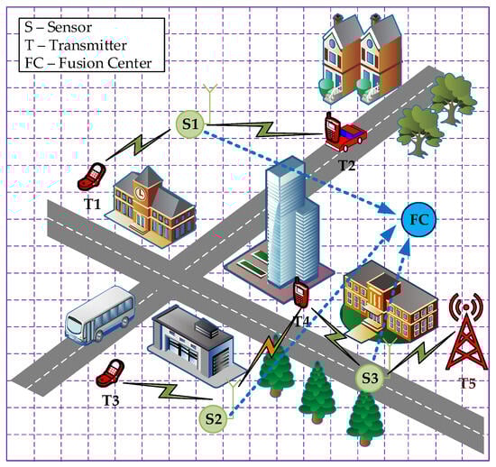 What seems to be lacking is a multidisciplinary approach to situation awareness enhancement based on a heterogeneous sensor network. In that case, knowledge more effectively reflects reality. Dedicated sensors can be used, whose task is only to conduct spectrum monitoring, or platforms that use cognitive radio technology, which transmit with other users and perform sensing to improve electromagnetic awareness [37,38,39]. From an operational point of view, the more complex and dynamic the environment, the more relevant information is needed. Thus, in complex scenarios, deploying many sensors and pervasive computing must be complemented by an adaptive sensing and fusion capability to extract relevant information for mission success. The basic information obtained in the radio spectrum-monitoring process is awareness of radio emissions in the specified bands. Many radioactivity detectors exist, e.g., energy, feature-based, cyclostationarity, etc. The detection result is information about a radio signal activity at a given frequency. When the detector cooperates with the classifier, it can also determine the transmission type for identification purposes (authorized or unauthorized entities). The proposed algorithm further contributes to situational awareness by indicating the estimated position of the radio transmitter (signal source). This solution demonstrates how the localization of a radio signal source (transmitter) using radio detectors (sensors) can be used for situational recognition. Figure 3 presents an example illustration of the proposed system application. Sensors (S1, S2, S3) represent a distributed radio detector network that passively monitors spectral resources. Each sensor in the network performs a detection process and generates a simple binary result: either positive if a signal is detected, or negative if no signal is detected. Transmitters (T1–T5) are radio signal sources that the system aims to locate. The arrows in the diagram, pointing from transmitters to sensors, represent the detection relationship. An arrow indicates that a given transmitter is within the detection range of a specific sensor, which depends on factors like transmitter power, sensor sensitivity, and propagation conditions. Conversely, the absence of an arrow signifies that the transmitter cannot be detected by that sensor (e.g., outside its coverage area). Fusion Center (FC) is the central element of data aggregation and fusion. As indicated by the arrows from the sensors to the Fusion Center, the FC receives the binary sensing results from all individual sensors in the network. The core algorithm is executed here to process the collected data to determine the transmitter’s location.