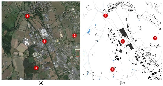 The 2 km × 2 km urban area was selected for the tests, with four sensors placed at arbitrary locations (Figure 5).