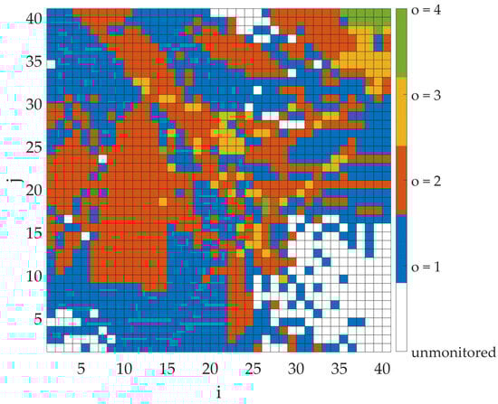This section presents the simulation results of the proposed algorithm based on the detection results from the four sensors presented in the scenario. Figure 6 shows the coverage map for cooperating sensors, presented as a graphical representation of the matrix for a fixed transmitter power level. Note, the figure does not show the estimated whereabouts of the transmitter. Instead, the color of each bin corresponds to the number of sensors that would cover the emitter if it were in that bin. As mentioned earlier, there may be bins in the analyzed area that are outside the sensors’ detection range (marked in white). The designation of such zones is also a significant outcome, especially from a security operations perspective. Thanks to such an analysis, additional sensors can be deployed to cover a hitherto unmonitored area or to provide physical protection for specific zones. In other cases, individual colors indicate the number of sensors () covering a given bin.
