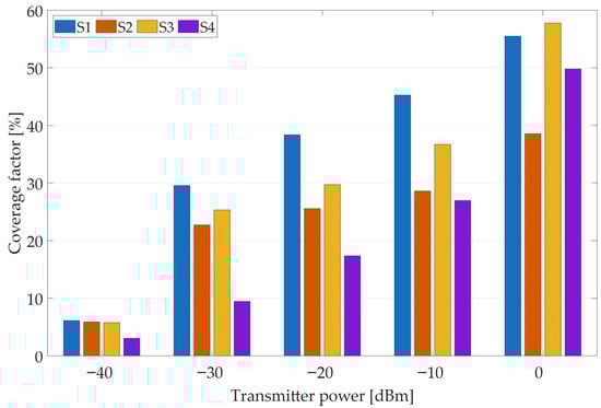 Figure 9 and Figure 10 show the coverage factor calculations for different transmitter powers and sensor configurations (individual sensors and the cooperation of several sensors, where S1 means sensor no. 1, S2—sensor no. 2, S3—sensor no. 3, and S4—sensor no. 4). In this case, due to the large number of possible variants, the analysis focuses on the scenario in which the algorithm considers only positive outcomes (i.e., signal detections). As shown earlier, additional information about negative results (i.e., the absence of signal detection by a given sensor) can also be incorporated, significantly improving transmitter localization accuracy. In each sensor configuration, as the transmitter’s power increases, the coverage factor also increases, i.e., the area of potential transmitter locations expands. Analyzing results from individual sensors, it can be seen that the estimated area size depends on the sensor’s location; e.g., sensor no. 4, with low transmitter power levels, has smaller coverage factor values than the other three sensors due to its location between buildings. On the other hand, if a transmitter is within its coverage area, determining its location will be more accurate. When information from an increasing number of sensors is considered, a more precise estimate of the transmitter’s position can be obtained (with a smaller coverage factor). The presented results illustrate the importance of determining transmitter power (based on contextual information from other sources, as mentioned earlier).