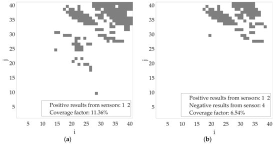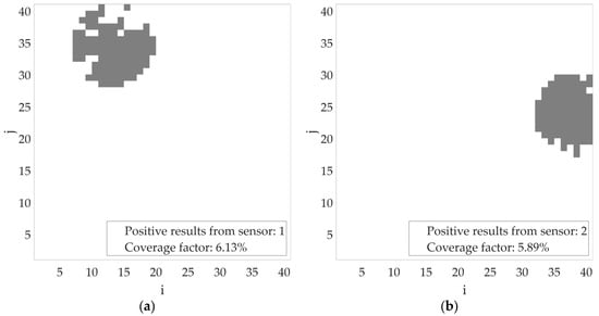 Considering a given bin, let introduce representing its indices in the analyzed matrix . Depending on the number of sensors used, their locations and parameters, and the power of the localized transmitter, a given bin may be monitored by more than one sensor. In such a case, an opportunity arises to leverage this fact when analyzing the results. Let us define a matrix containing values for each bin, denoting the number of sensors that cover a given part of the area with their detection range: