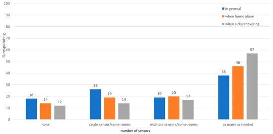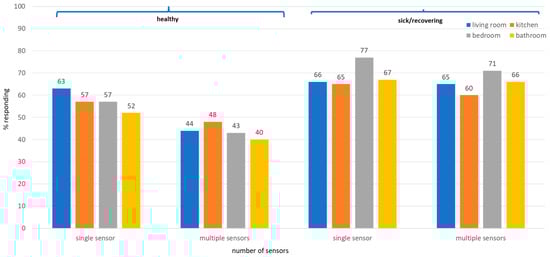 p < 0.001). When sick compared to when healthy, individuals were 2.65 times more likely to prefer installing multiple sensors in the living room, 1.75 times more likely in the kitchen, 3.66 times more likely in the bedroom, and 3.41 times more likely in the bathroom (