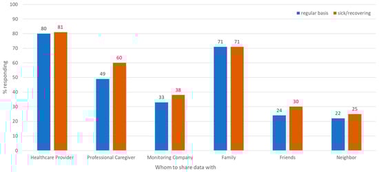 p < 0.05). Regarding data sharing, participants were most willing to share information with healthcare providers and family members on a regular basis (80 and 81%, respectively) and 71% on a regular basis or when sick/recovering. Comfort with data sharing with professional caregivers (OR = 1.67;