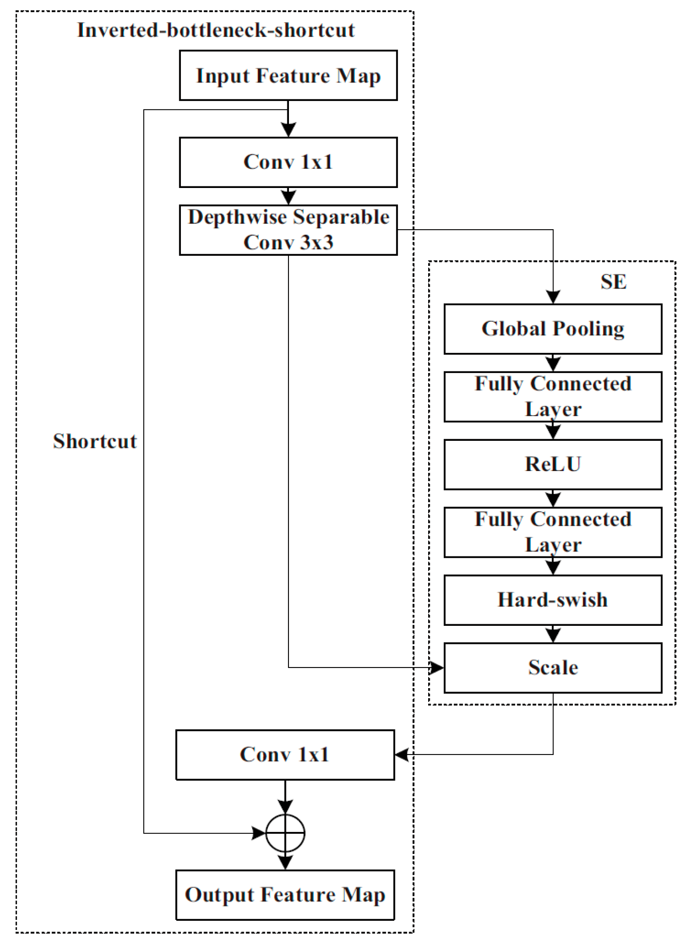 18], and activation functions Hard-sigmoid and Hard-swish which are composed of Conv2D, Inverted-bottleneck, Inverted-bottleneck-shortcut, and pooling. The Inverted-bottleneck consists of two 1 × 1 convolutions and a 3 × 3 deep separable convolution. In the latter, the feature map of each layer is convolved by using the appropriate convolution kernel separately, considerably reducing the number of parameters and computational complexity, while also enhancing the convolution speed. The Inverted-bottleneck-shortcut contains a shortcut in addition to Inverted-bottleneck. The shortcut can fuse the output feature map of the convolution layer and the input information so as to prevent gradient explosion.