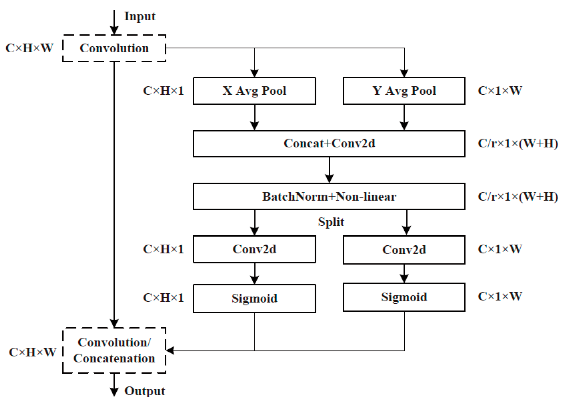 19] to realise the weighted fusion of features. Considering that each 1 × 1 convolutional layer in the head section can obtain a greater degree of global information, the CA attention mechanism is added after the convolution layers in the head component. The results O of the fast normalised fusion process are as follows: