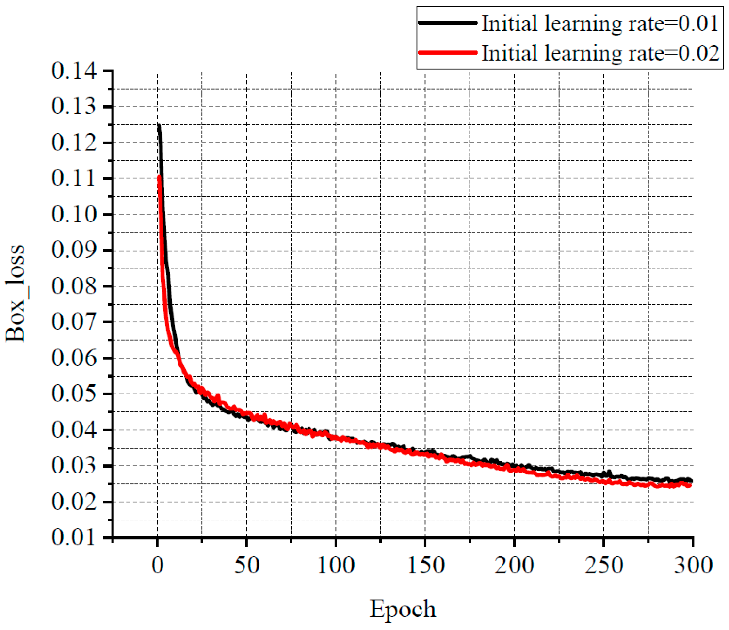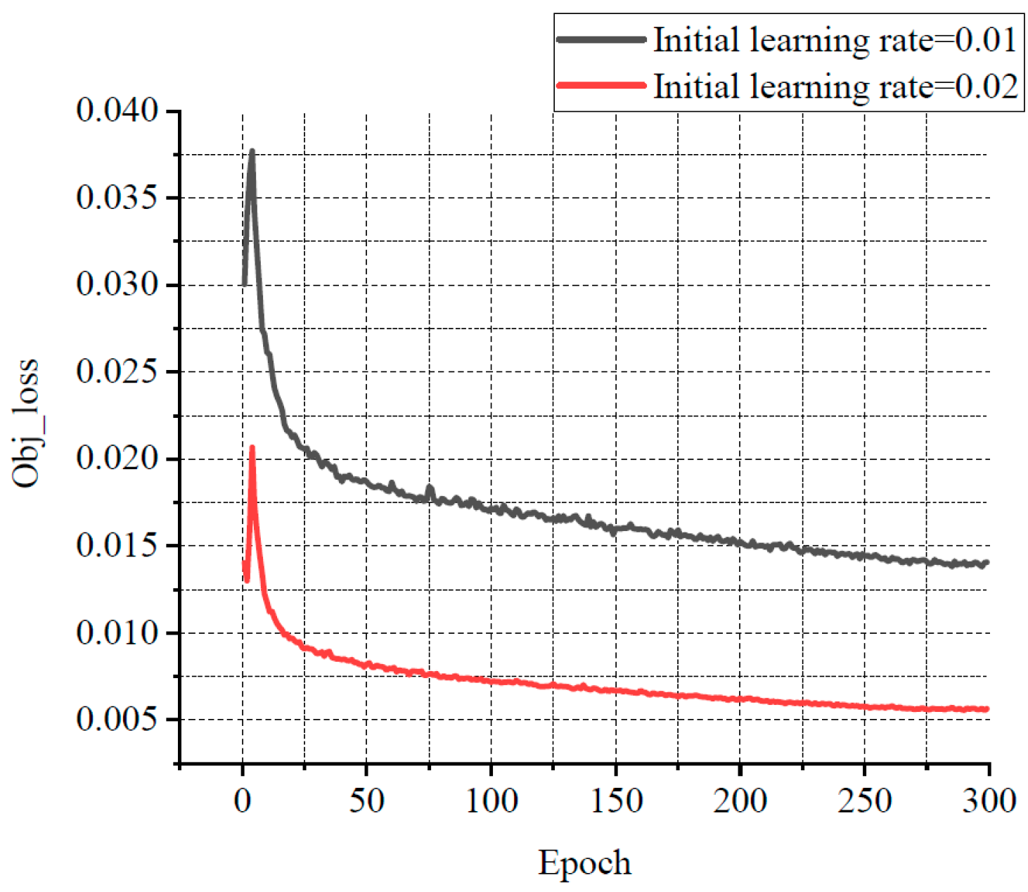 29]. Therefore, the learning rate in this experiment was set to 0.02 with a decay rate of 0.3, and the final learning rate was 0.006. According to the change of the losses with the number of iterations, the number of iterations was set to 300. The batch size was set to 33. In order to avoid missing small defects as much as possible, the resolution of the input image was adjusted to 960 × 960.