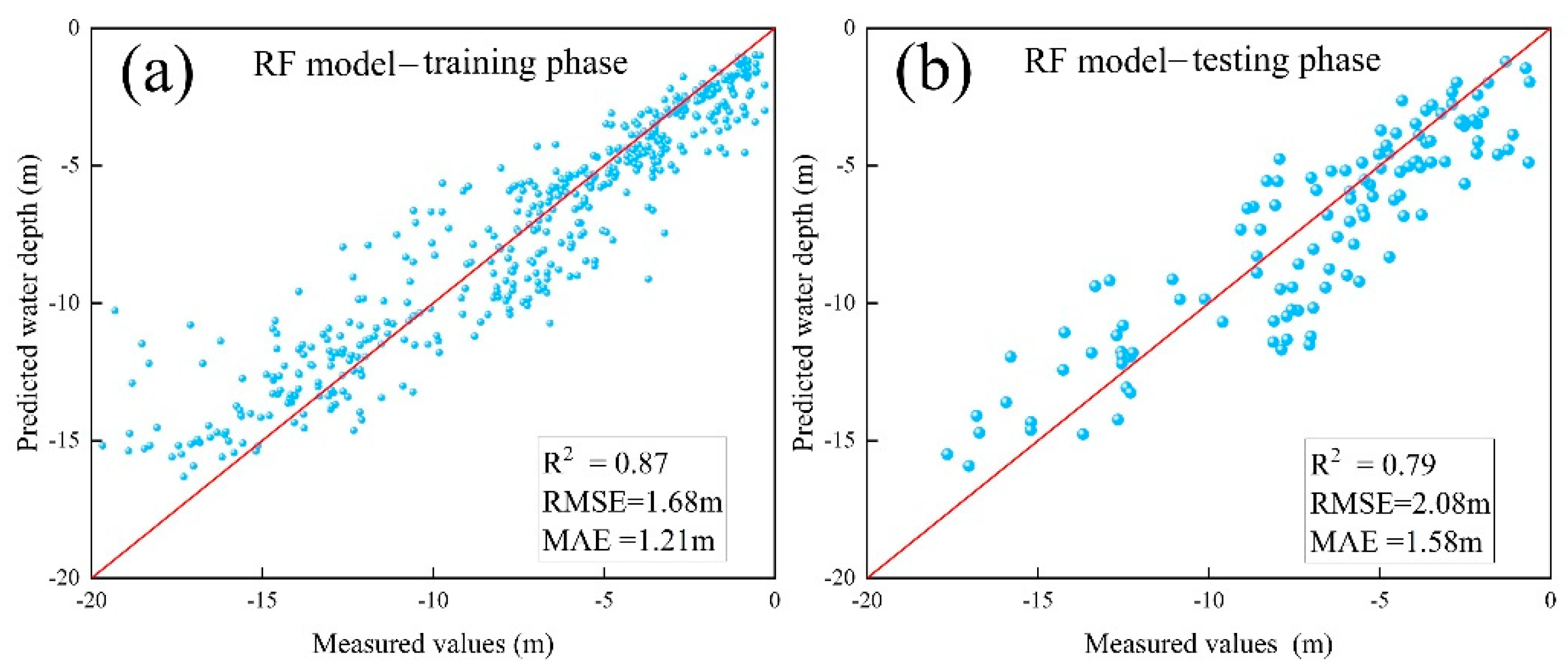 - Zhou, W.; Tang, Y.; Jing, W.; Li, Y.; Yang, J.; Deng, Y.; Zhang, Y. A Comparison of Machine Learning and Empirical Approaches for Deriving Bathymetry from Multispectral Imagery. Remote Sens. 2023, 15, 393. [Google Scholar] [CrossRef]