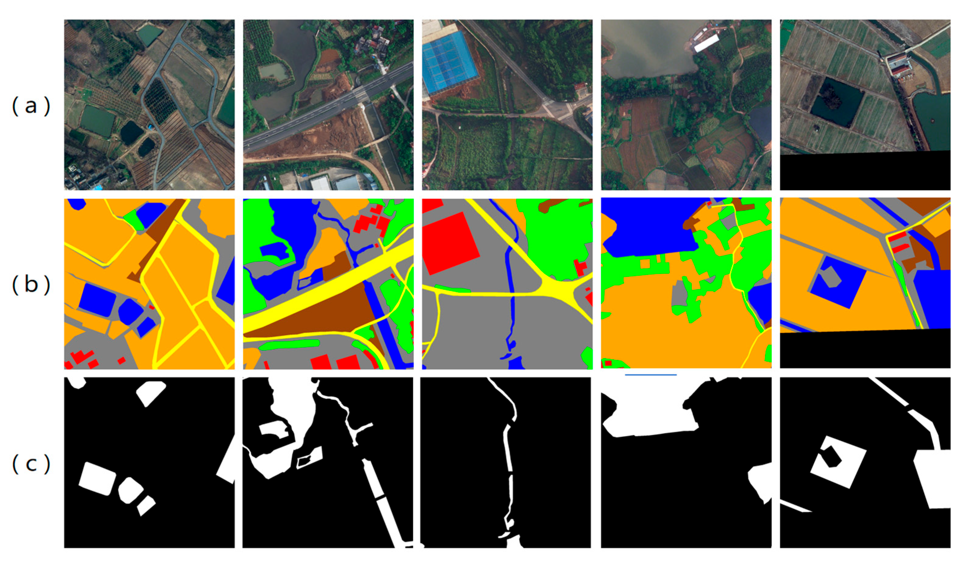 - Wang, J.; Zheng, Z.; Ma, A.; Lu, X.; Zhong, Y. LoveDA: A Remote Sensing Land-Cover Dataset for Domain Adaptive Semantic Segmentation. arXiv 2021, arXiv:2110.08733. [Google Scholar] [CrossRef]
