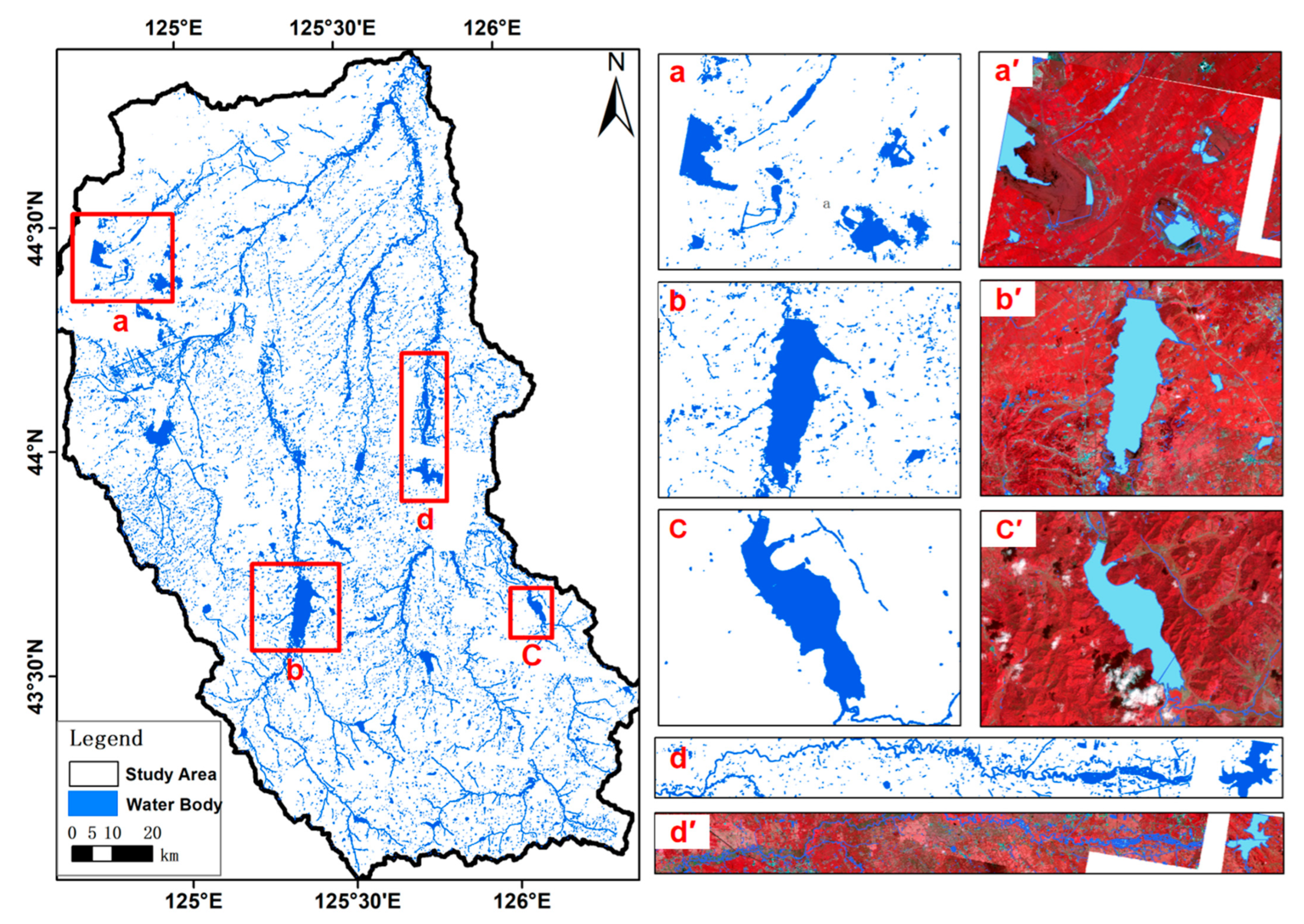 - Pekel, J.F.; Cottam, A.; Gorelick, N.; Belward, A.S. High-resolution mapping of global surface water and its long-term changes. Nature 2016, 540, 418–422. [Google Scholar] [CrossRef]
