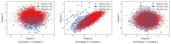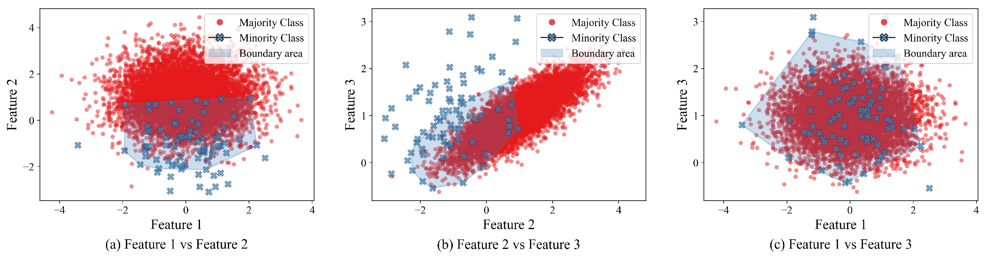 make_classification(n_samples=10000, n_features=3, n_redundant=0,n_clusters_per_class=1, weights=[0.99],flip_y=0, random_state=1) The make_classification function from the sklearn.datasets library in Python 3.10.15 creates n_samples=10000 samples, with three non-redundant features (independent variables); the minority and majority classes will consist of a single cluster with no noise, and the IR (IR) would be 99:1. That is, 1% of the samples would belong to the minority class.Figure 1 depicts the generated dataset (majority class samples depicted in red; minority in blue) and the boundary area (shown in shaded blue) from a synthetic dataset created above. Note that the area varies depending on the features being compared and the dataset’s geometry. - Some feature pairs might have high separability (i.e., Figure 1b), while others might have overlapping classes (i.e., Figure 1c). Thus, we apply a weighted locally aware interpolation within a threshold. To do so, we use a custom threshold distance to limit the area around each nearest minority class. This distance is used to assign weights to each minority point. Then, we apply conditional branching based on this weight; thus, even when the minority class data is sparsely distributed in the dataset, we can generate samples from the closest minority neighbors.