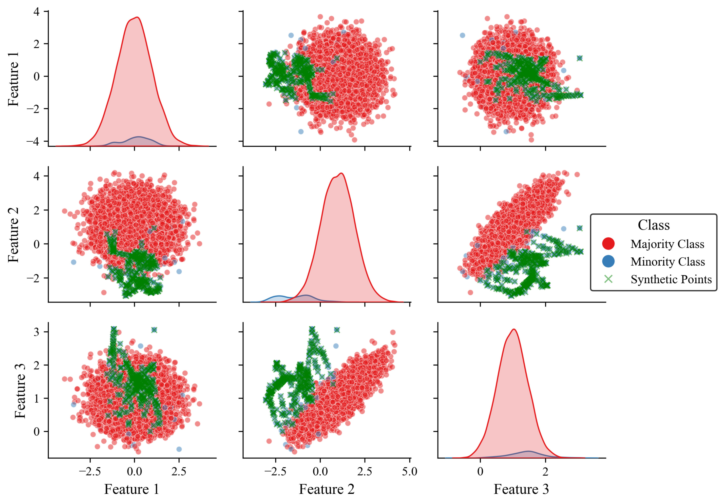 - Contrary to traditional approaches, such as SMOTE, ADASYN, and Borderline-SMOTE, which create the same number of samples as the majority-class data, we adopt a more conservative approach, producing only samples that fall within the boundary area, thereby avoiding over-inflating the dataset with samples that might affect its performance.