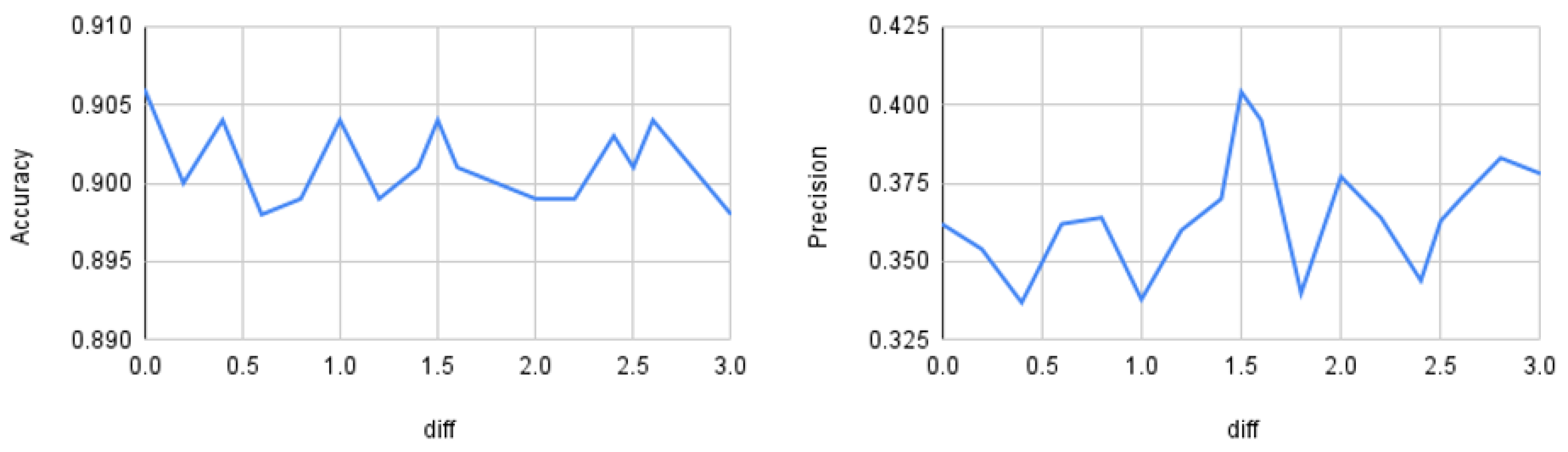 - When no majority-class points () exist nearby the k neighboring points (measured by the distance dif) that are within the threshold (), then no synthetic data is generated as it would not be within the boundary area, as detailed in lines 7 and 8 in Algorithm 1.