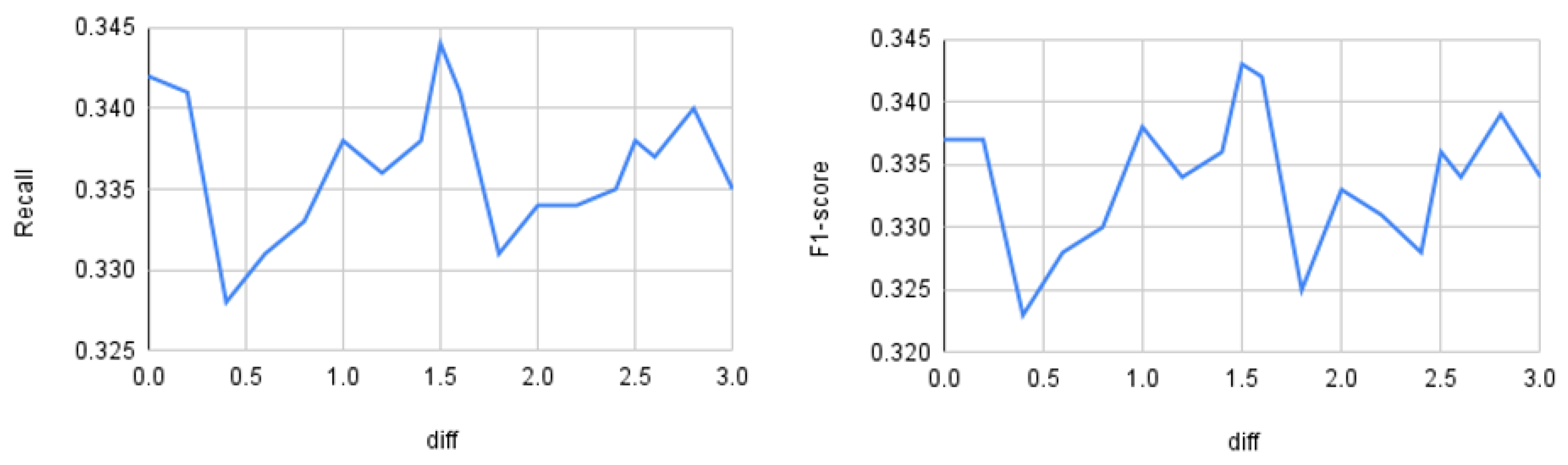 | F1 | 0.333 | 0.358 | 0.335 | 0.340 | 0.389 | 0.391 | |