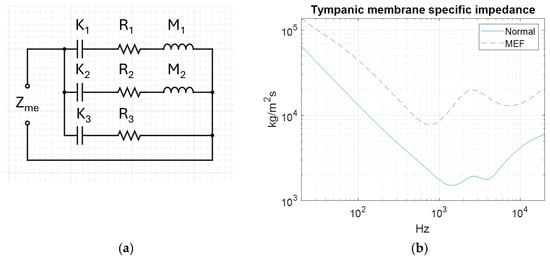 Electric analogue model (a) and tympanic membrane impedance (Zme) by frequency for normal and middle ear fluid conditions (b).
