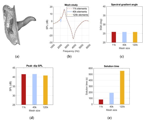 Illustration of (a) a mesh model with 40k elements, (b) a spectrum graph, (c) spectral gradient angle (SGA), (d) peak–dip sound pressure level (SPL), (e) solution time for the 11k-, 40k-, and 120k-element meshes.