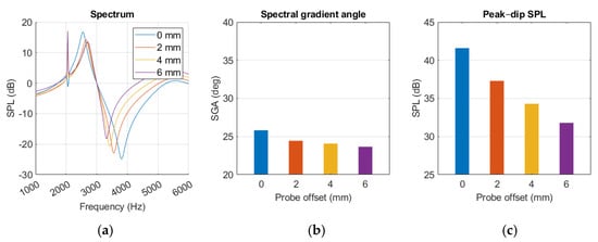MEF simulation with variations in probe offset position, presented as (a) spectrum graph, (b) spectral gradient angle, (c) peak–dip sound pressure level chart.