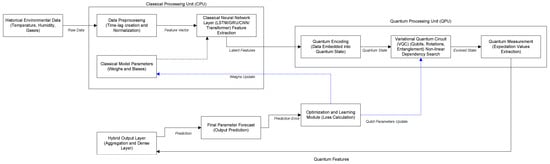 As depicted in Figure 1, the proposed architecture synergizes classical and quantum computing paradigms. A Classical Processing Unit (CPU) is responsible for the initial data preprocessing and feature extraction, utilizing deep learning layers such as LSTM, GRU, or Transformers. The extracted features are then mapped into a quantum state within the Quantum Processing Unit (QPU). Here, a Variational Quantum Circuit (VQC) is employed to process the latent feature space, capturing complex non-linear dependencies that are often intractable for classical algorithms alone. The quantum measurement results are subsequently aggregated in a hybrid output layer to generate the final forecast. The entire system is trained end-to-end, with an optimization module employing a feedback loop to simultaneously update both classical weights and quantum circuit parameters based on the prediction error.