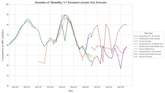 The data for this study were sourced from three automated Vaisala AQT420 environmental monitoring stations (Vaisala, Vantaa, Finland) located in distinct zones within the city of Kremenchuk, Ukraine: “Gymnasium No. 26” (a residential/educational area), the “Northern Industrial Node” (an industrial zone), and the “Favorit” district (a high-traffic commercial area). The dataset comprises monthly averaged readings for five key parameters: relative humidity (%), ambient temperature (°C), atmospheric pressure (GPa), carbon monoxide (CO, mg/m3), and nitrogen dioxide (NO2, mg/m3). The data spans a period of 35 months, providing a limited but challenging time series for forecasting.