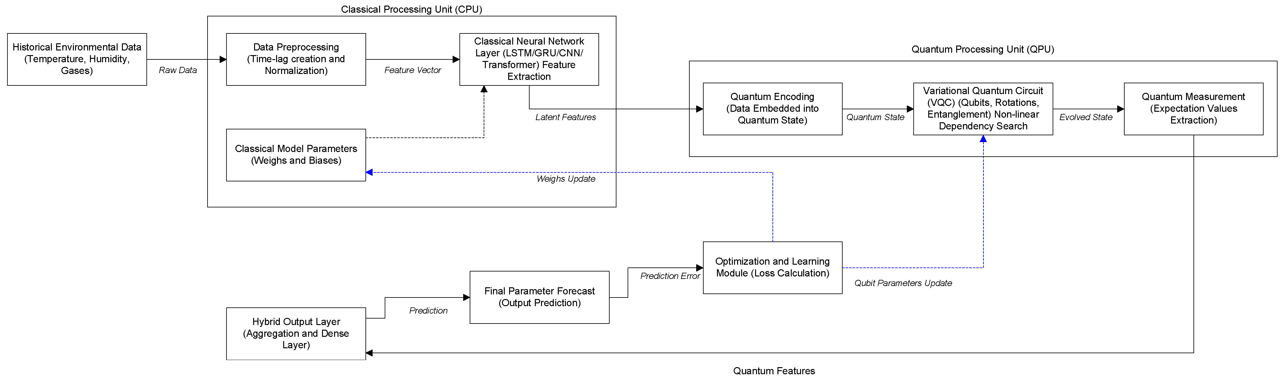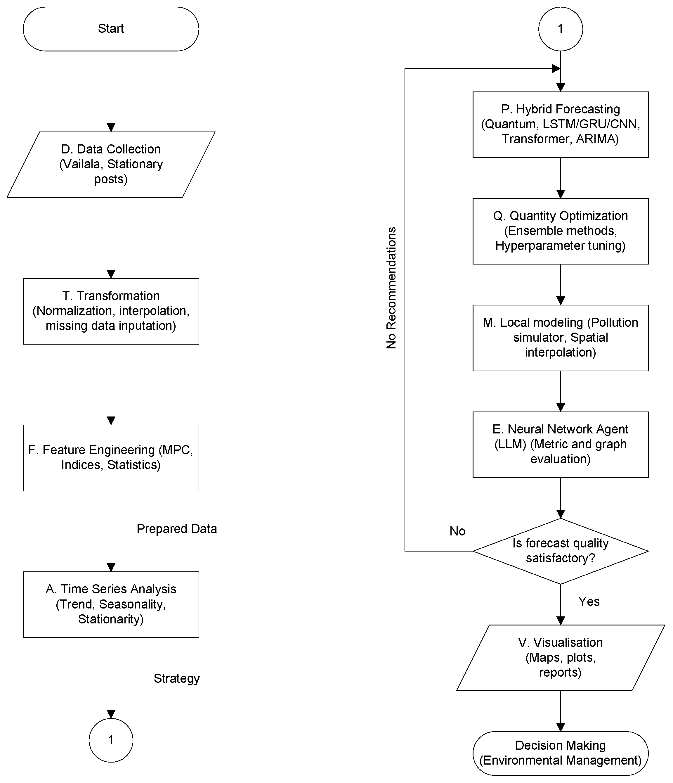 Despite these advancements, several critical gaps remain in the application of advanced computational methods to urban environmental monitoring. First, the existing research often treats forecasting, spatial analysis, and simulation as isolated disciplines. There is a clear need for a unified, conceptual framework that integrates these components into a cohesive analytical pipeline, especially one that can accommodate emerging technologies like QML and Large Language Model (LLM)-based analysis. The fragmented presentation of these elements in many studies hinders the development of a holistic environmental intelligence system [