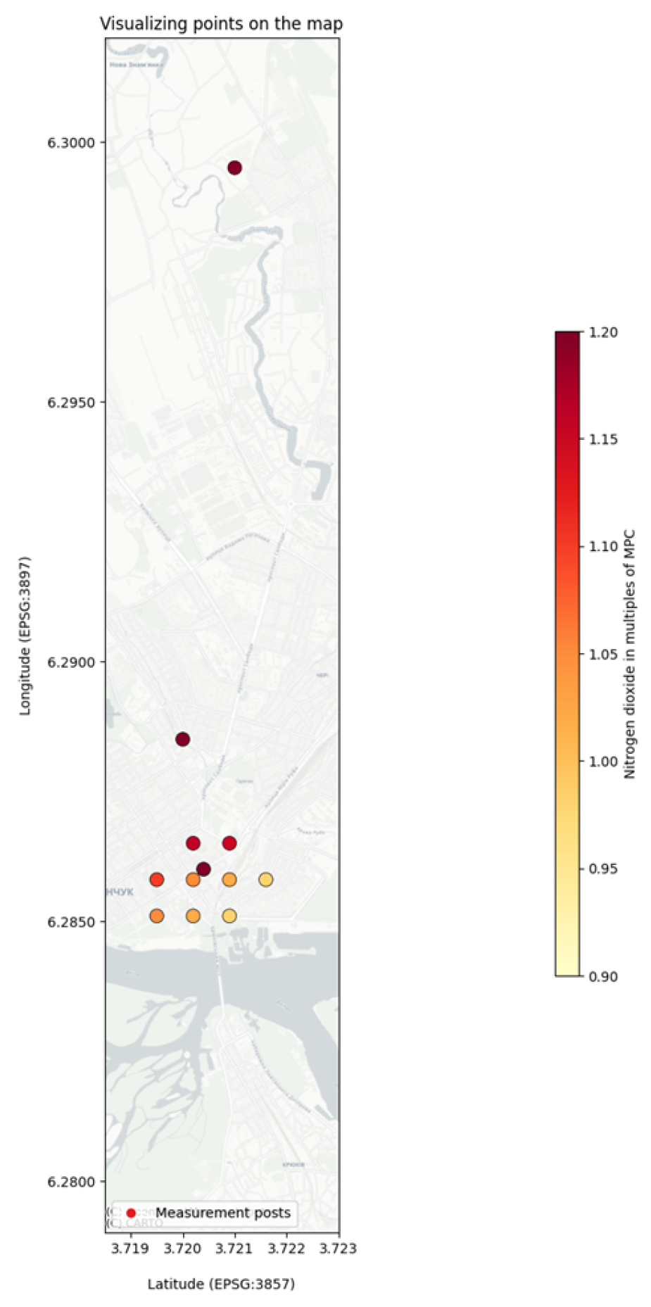 Figure 8b show that the center of the map shows the highest pollution, from nitrogen dioxide, which corresponds to the darkest level on the pollution interpolation map based on laboratory pollution measurement points in Kremenchuk (the darker the level, the greater the pollution in
