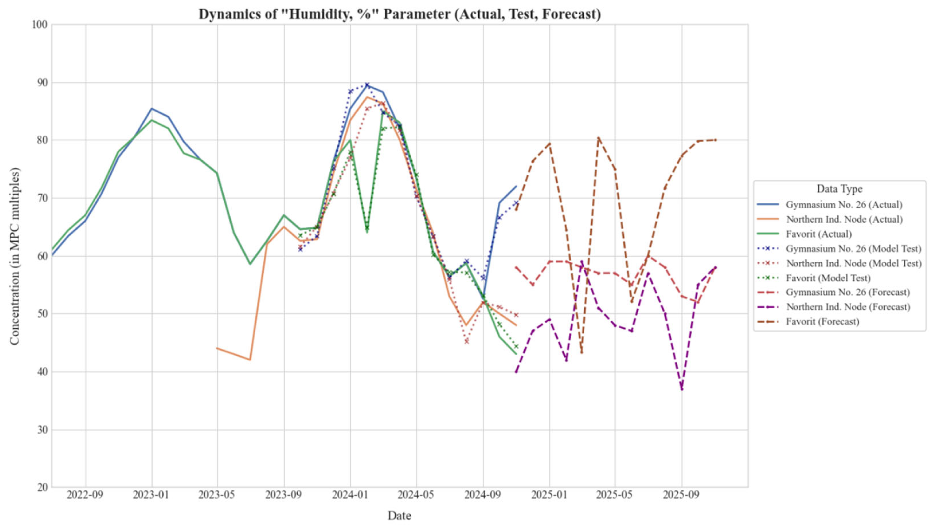 Model performance variability. The performance of forecasting models varies significantly depending on the environmental parameter and location. Some models predict well for certain parameters, such as Nitrogen Dioxide, but poorly for others, such as Humidity, %.