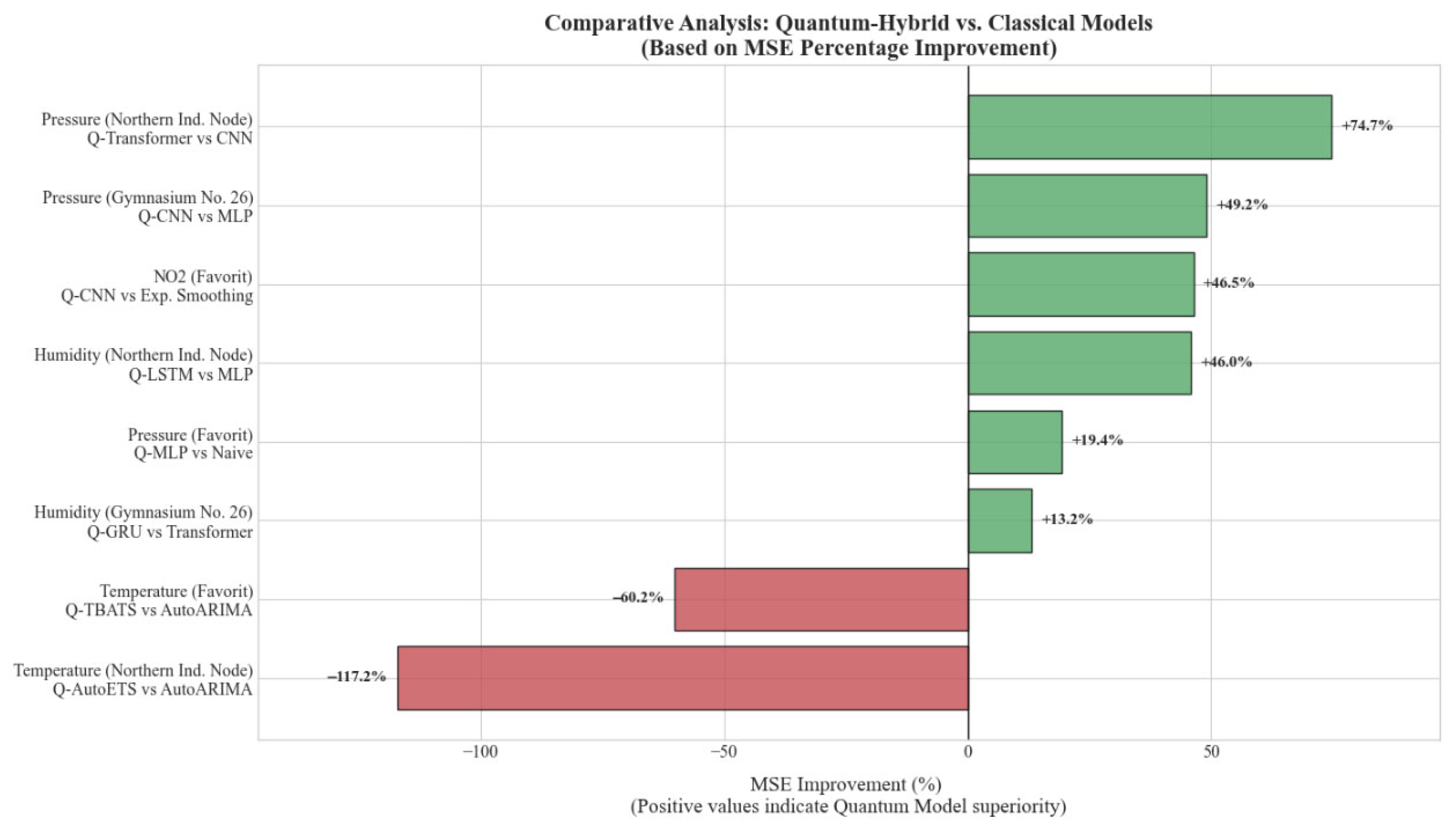 For nitrogen dioxide, quantum models showed strong gains in the industrial and high-traffic zones (−49.23% and −46.46% MSE change) but performed poorly in the residential zone (+57.30%). Conversely, for carbon monoxide, quantum models consistently underperformed their classical counterparts. This suggests that the nature of pollutant dynamics—driven by highly irregular and non-linear anthropogenic activity—is extremely difficult to model. The quantum models, run on ideal, noise-free simulators, may be overfitting to the noise in these complex signals, a known risk with powerful models on small datasets [