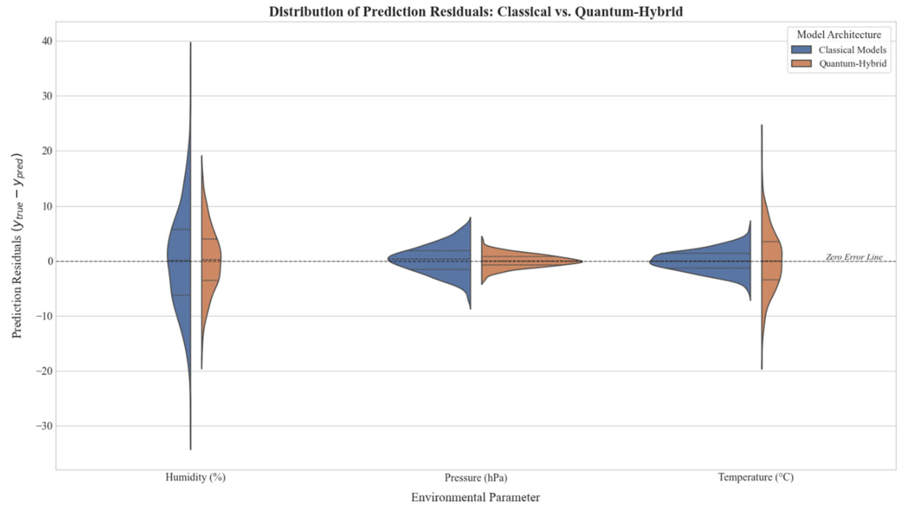 Real quantum processors suffer from qubit decoherence and gate errors. In a physical deployment, the accumulation of noise in the VQC depth used (3–6 layers) would likely degrade the forecast accuracy further than observed here. Therefore, the reported “quantum advantage” in humidity forecasting must be validated on real hardware using error-mitigation techniques (e.g., Zero-Noise Extrapolation) in future work.
