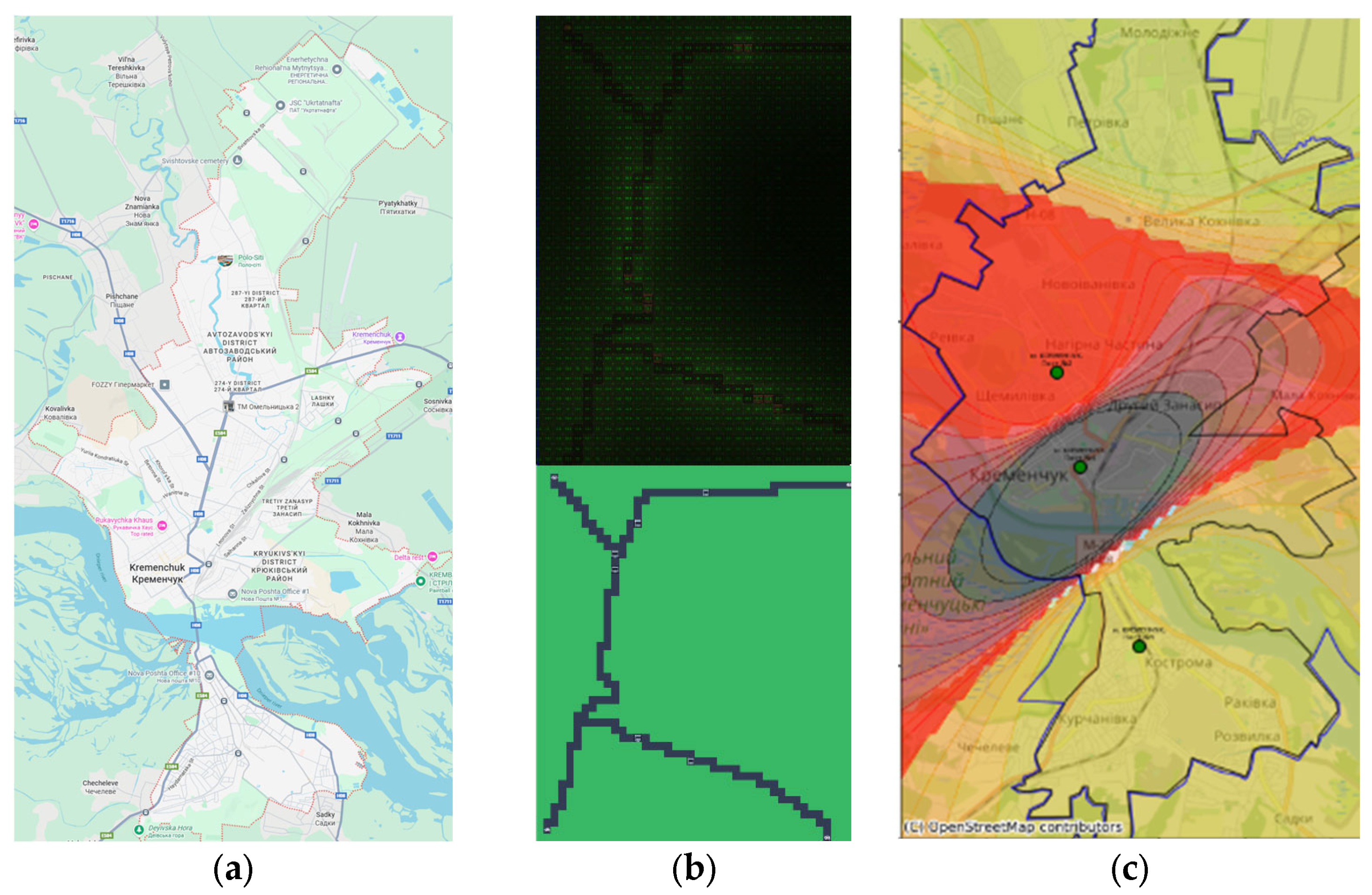 Figure 8 demonstrates correspondence between physical map of researched area (a), map simulated in the application (b) and spatial interpolation of pollution data (c) derived basing on the mobile laboratory pollution measurements.