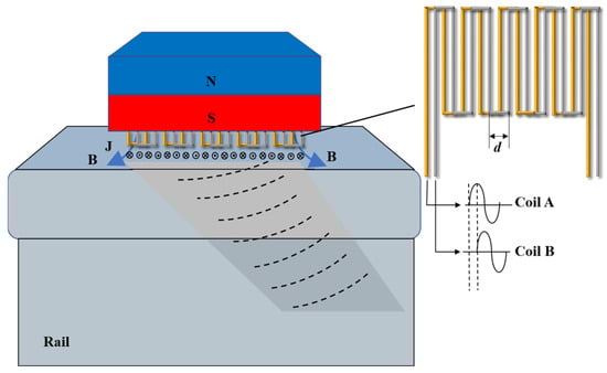Electromagnetic Acoustic Transducer (EMAT) technology, with its advantages of non-contact excitation, no need for a couplant, and strong environmental adaptability, provides an innovative solution for faster dynamic rail flaw detection. Many scholars have conducted in-depth research on applying this technology for rail inspection. Dixon et al. [11,12,13] utilized EMAT-excited Rayleigh waves and guided waves to detect transverse or longitudinal cracks in rail heads. They also designed a surface wave EMAT with a magnet lift-off distance increased to 10 mm, achieving a detection speed of up to 160 km/h. Mi et al. [14] designed an EMAT narrowband surface wave coil, which successfully detected various defects, such as rail cracks and nuclear damage. Lu et al. [15] effectively identified rail tread cracks and switch rail base damage using surface waves and SH-guided waves. These researchers employed low-frequency guided waves of different modes to inspect the railhead. It should be noted that as the frequency decreases, the wavelength increases, resulting in lower sensitivity to defects and a higher probability of missed detections. Additionally, both the Rayleigh wave and SH-guided wave propagate along the surface, enabling detection of only surface defects in rails. Liu et al. [16] demonstrate that rail subsurface inspection by using a spiral-coil EMAT is feasible and the high frequency can contribute to distinguishing the echo signal from the rail subsurface crack. However, according to the relevant standards for locomotive vehicle clearance in standard gauge railway requirements, ultrasonic sensors must be installed above the rail surface to avoid interference with the track during operation.