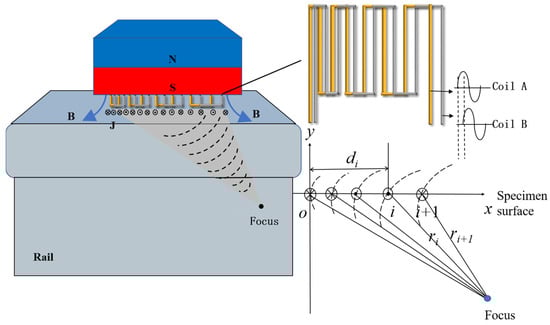The LFSV-EMAT is an oblique-incidence EMAT. It has a variable coil spacing pattern. Wire spacing is affected by multiple factors. These include focal point coordinates, incident angle, and excitation frequency. The calculation method is shown in Figure 2. Consider a set of given design parameters. They include the excitation signal frequency . They also include the focal point coordinates (, ). The horizontal coordinate (, 0) of the leftmost coil is another. The incident angle concerning the focal point is also included. The position of all wires can be determined. The key relationship is this: the propagation path difference from the -th to the -th source to the focal line equals half the wavelength. The calculation formula is as follows: