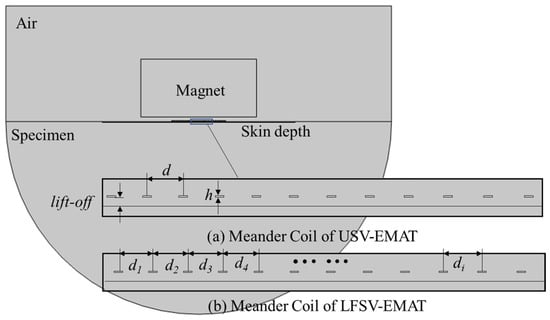 Figure 1 and Figure 2 illustrate the structural schematics of USV-EMAT and ULFSV-EMAT. As depicted in Figure 1, the USV-EMAT is classified as an oblique-incidence EMAT with a fixed coil spacing pattern; specifically, its curved coil maintains a constant spacing denoted as d. The primary radiation angle θ of the ultrasonic wave can be determined using the following equation: