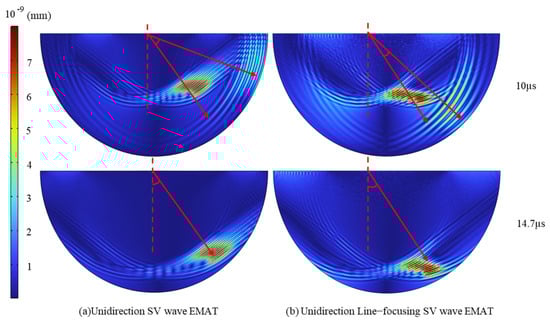 Based on the established USV-EMAT and LFSV-EMAT finite element simulation models of 37°, simulations are carried out to obtain the production and propagation processes of EMAT in the specimen for both structures. Figure 4a presents USV-EMAT wavefield snapshots at t = 10 μs and t = 14.7 μs, Figure 4b shows the corresponding results for LFSV-EMAT. These diagrams illustrate the behavior of the ultrasonic waves produced and propagated by the EMAT structures within the material, highlighting their performance over time at different moments.