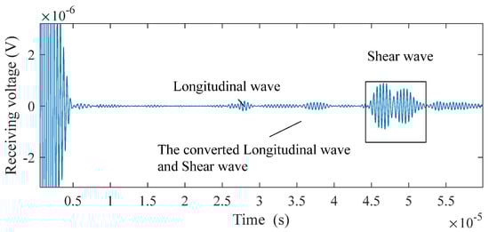 Figure 9 presents a comparison of the received signal between the single-coil probe with a meander excited coil and the dual coil probe with a racetrack received coil. This study found that the type of received coil did not affect the overall shape of the time-domain waveform of the received signal. Based on the characteristic that the speed of L-wave is twice that of SVs, the first echo signal in the figure corresponds to the reflected echo of the L-wave, while the second echo signal is the result of the superposition of echoes generated by the longitudinal-to-shear and shear-to-longitudinal mode conversions. The final echo signal, which has a higher intensity peak, was confirmed through analysis to be the effective reflection of obliquely incident SVs.