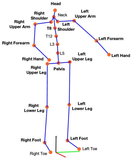 The whole-body kinematics were obtained by using the software Xsens MVN Analyze, Enschede, The Netherlands) version 2022.0.2, which combined the data of all IMUs with advanced biomechanical models to obtain the position and orientation of all human body segments. According to the Xsens protocol, 23 keypoints all over the human body were extracted: 17 from the corresponding sensors placed on the subject and 6 additional segments (Figure 2) estimated by combining the information of the connected segments and the biomechanical model [35].