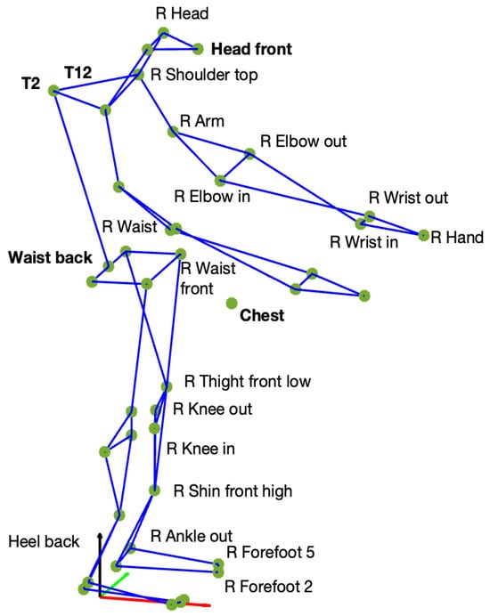 Keypoints extracted from ML data using the Qualisys Sports markerset, specified for the right side (e.g., R Waist). Symmetrical markers were also extracted for the left side (e.g., L Waist), except for the keypoints shown in bold, which are not side-specific (e.g., Waist back). The small circles represent the individual keypoints, and the colored lines indicate the biomechanical connections between them to form the reconstructed skeleton.